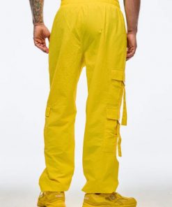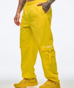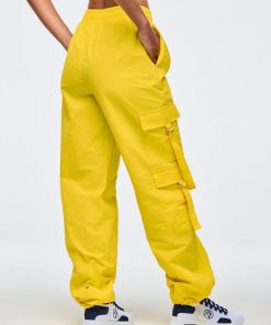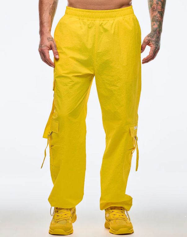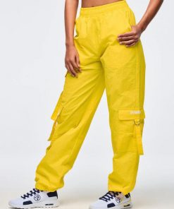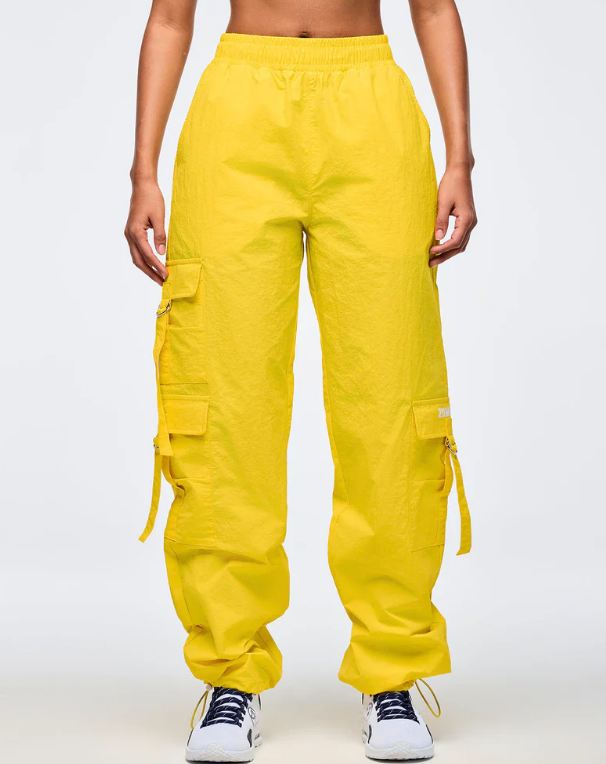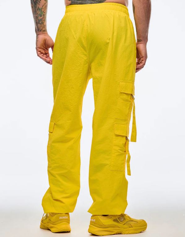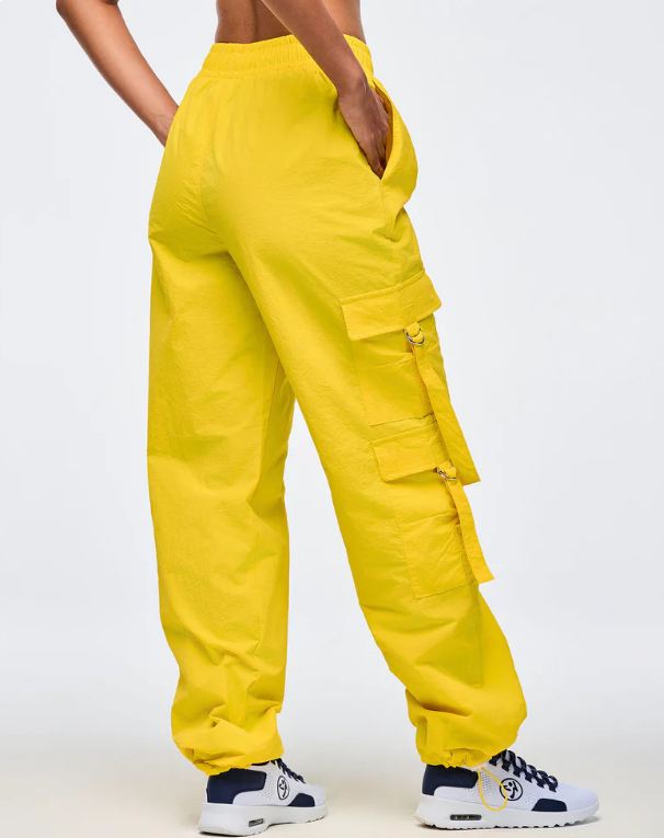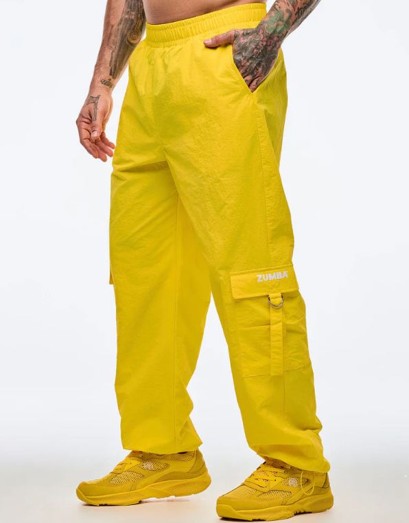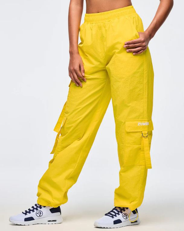 These high-rise cargo pants feature a 31 1/2″ inseam and are crafted from lightweight, swishy nylon fabric. Designed with side cargo pockets on each leg, slanted upper pockets, and an encased elastic waistband for comfort. The bottom leg openings include a functional bungee drawcord, while a Zumba print on the pocket adds a stylish touch. With an oversized fit and long length, these pants offer both practicality and flair.