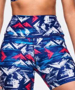 These blue and white high-waisted biker shorts feature a 5 1/2″ inseam and raw edges on the leg openings for a comfortable, flattering fit. The fold-over waistband contains no internal elastic, ensuring smooth wear. With a slim fit and exclusive Zumba all-over print, these shorts offer stylish performance in a short length.