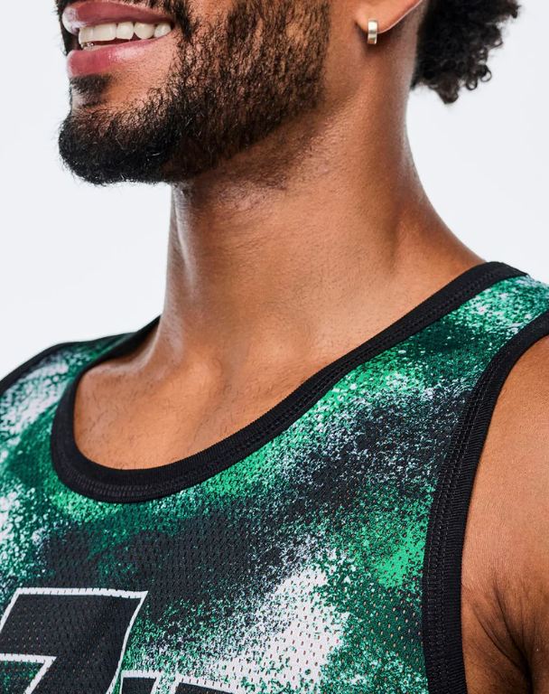 This men’s basketball tank features rib-knit binding on the neck and armholes for a comfortable fit. The lightweight fabric showcases a bold engineered graphic on the front, offering a relaxed fit with extended length for easy movement and style.