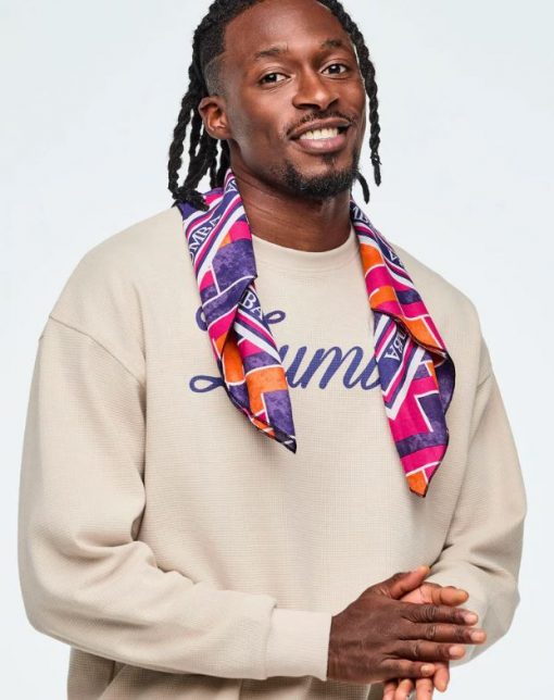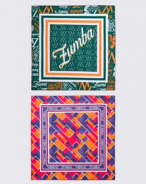 • Bandana #2 has an emblematic all over print background with a centered script Zumba with a multicolor drop shadow
