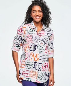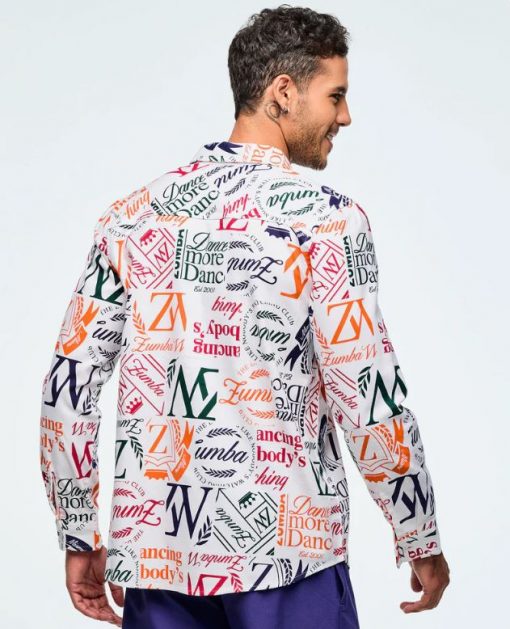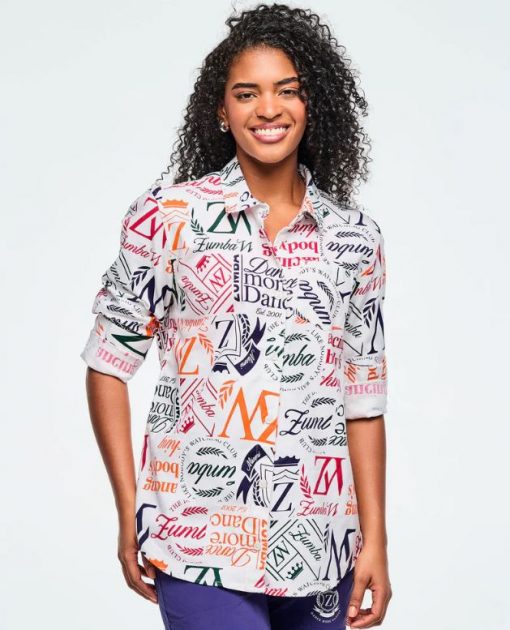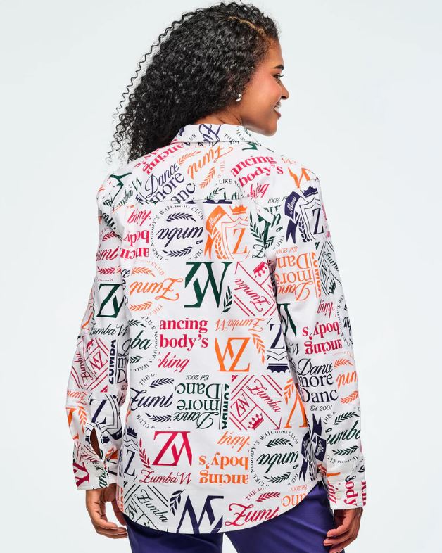This woven button-up shirt features a back yoke and comes with an extra button for added convenience. Showcasing a unique Zumba-exclusive all-over print, it offers an easy fit and extended length for comfortable, stylish wear.