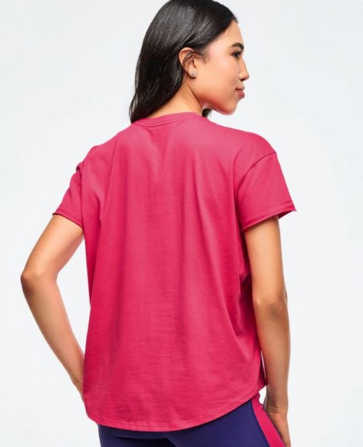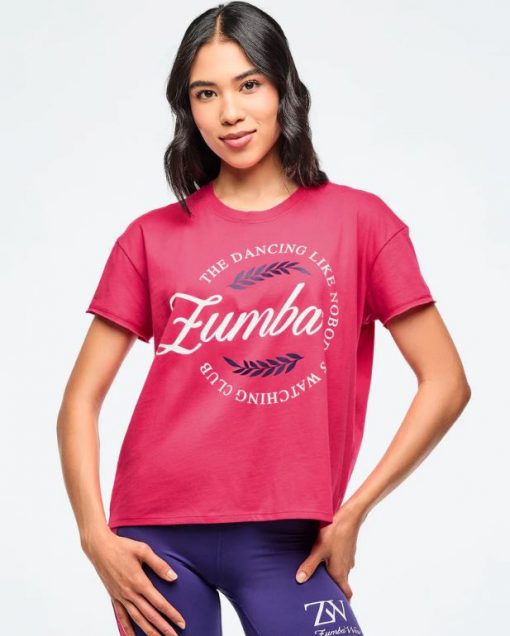 Experience effortless style with this top, featuring a ribbed knit collar and a trendy high-low hem. The raw edge sleeve adds an edgy touch, while an exclusive Zumba graphic showcases your unique spirit. Designed for a relaxed fit and regular length, it offers comfort without compromising on flair.