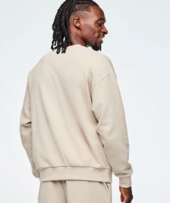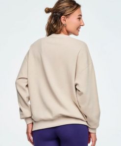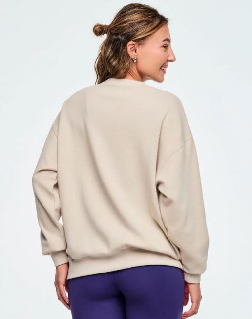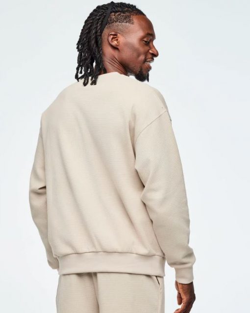 This oversized pullover waffle sweatshirt features rib knit cuffs and a bottom band for a snug fit. It showcases a lightweight branded print on the front and offers a roomy, extended-length design for lasting comfort and style.
