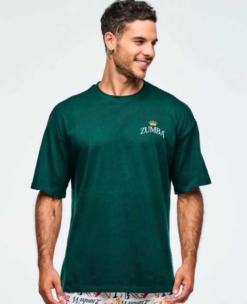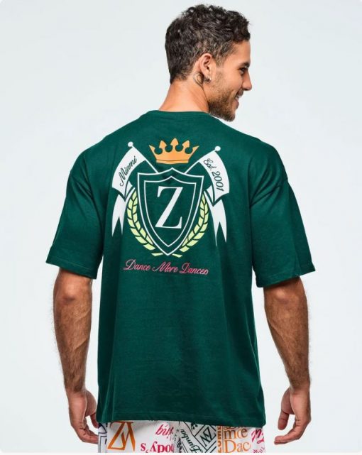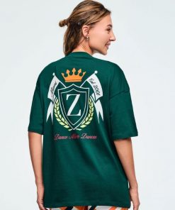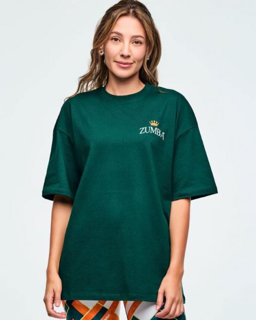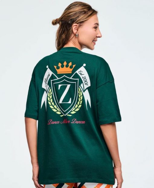 Featuring a rib knit collar and an oversized drop shoulder design, this top showcases branded artwork on the chest and a large, exclusive Zumba graphic on the back. With its roomy fit and extended length, it delivers both comfort and standout style.