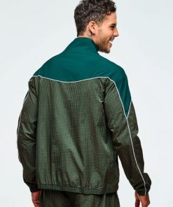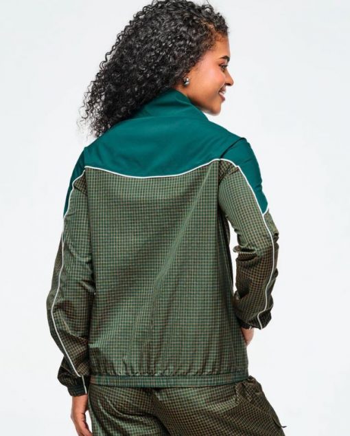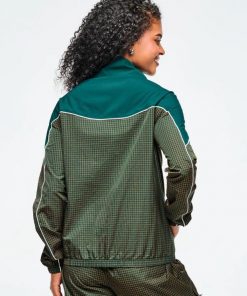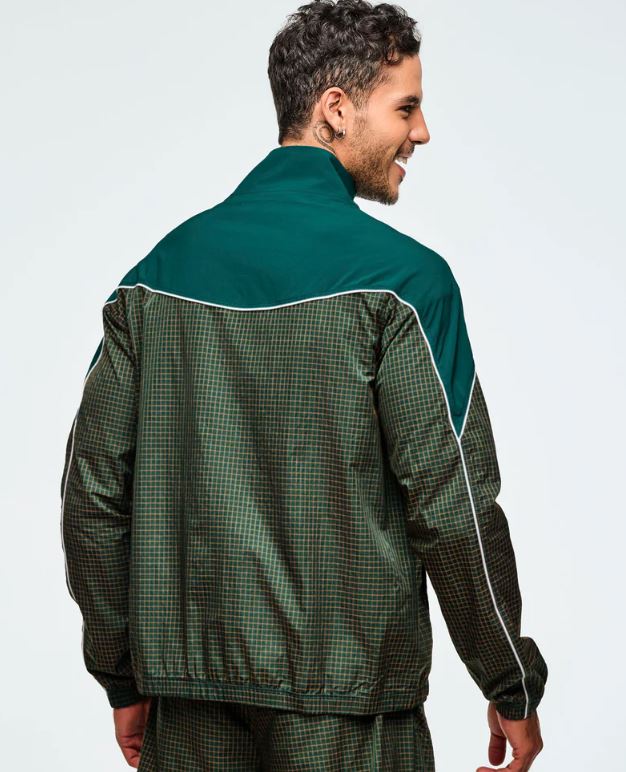 This mock neck jacket features a front zipper closure and encased elastic on the cuffs and bottom band for a secure fit. Its curvy yoke seam with contrast piping adds a stylish touch, complemented by front inseam pockets for convenience. Made from non-stretch two-tone ripstop woven fabric, it includes an embroidered branded graphic on the chest. Designed with a relaxed fit and extended length, it offers both comfort and a distinctive look.