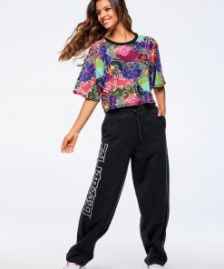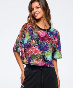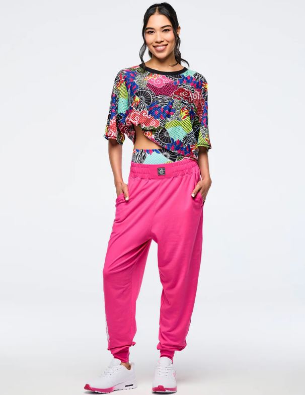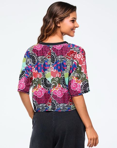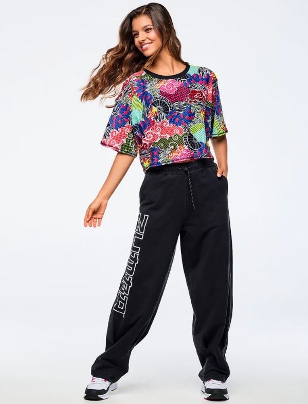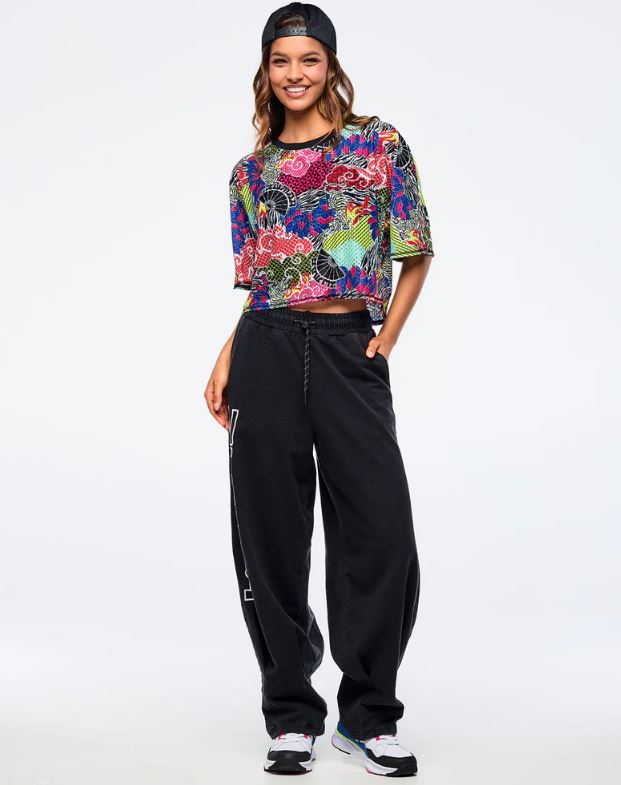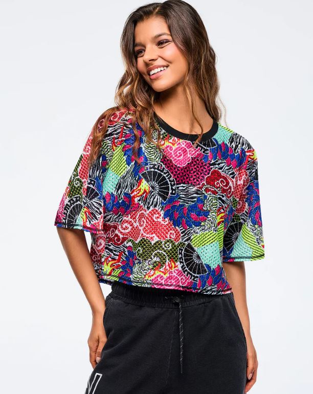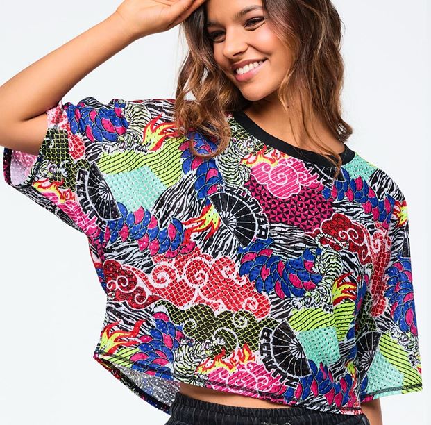 Make a statement with this eye-catching crop top featuring an all-over graphic print that demands attention. The relaxed dolman silhouette drapes beautifully while the structured rib knit neckband anchors the look with polish. With its cropped length and generous fit, this Zumba piece delivers comfort without compromising on attitude—perfect for those who want their style to speak as loud as their moves.