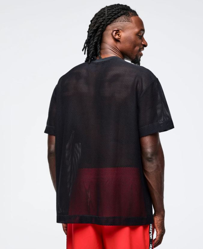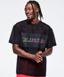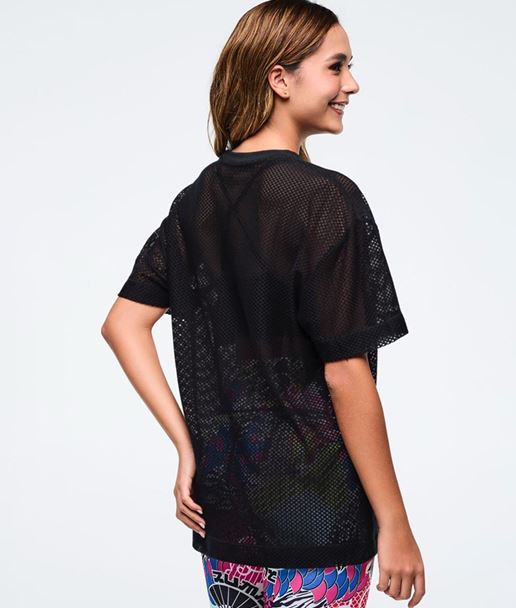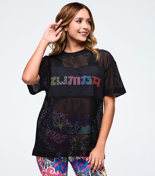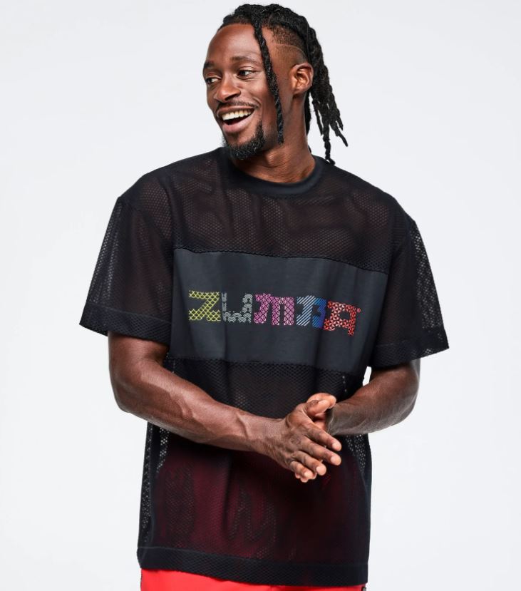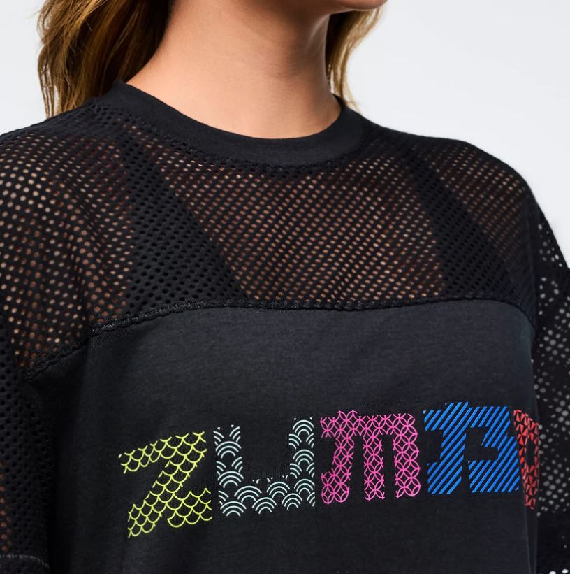 Showcase your Zumba spirit with this boxy mesh top featuring bold branded artwork across the chest. The structured rib knit collar adds polish while the oversized fit ensures all-day comfort and movement. Cut at an elongated length, it’s the perfect canvas for expressing your style—whether you’re dancing, training, or just living your best life.