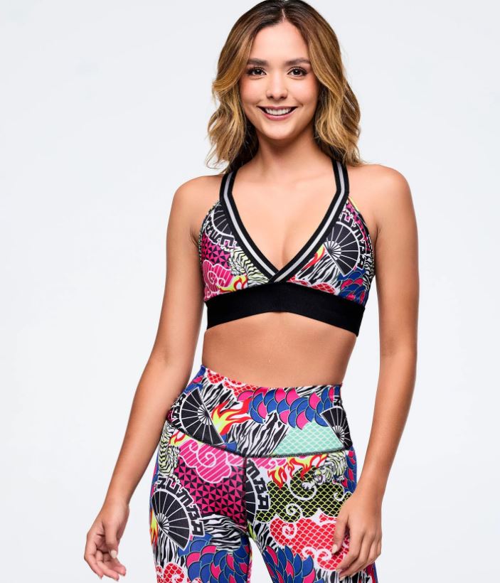 Elevate your Zumba practice with this vibrant V-Bra designed for dynamic movement. Featuring customizable removable cups, you’ll find the perfect fit for your comfort level. The eye-catching allover print celebrates Zumba’s bold energy, while the exposed elastic waistband showcases sublimated artwork that keeps you looking fierce. A signature Zumba branded rubber patch adorns the back, and the slim, cropped silhouette moves with you through every rhythm. Built for dancers who demand both style and performance.
