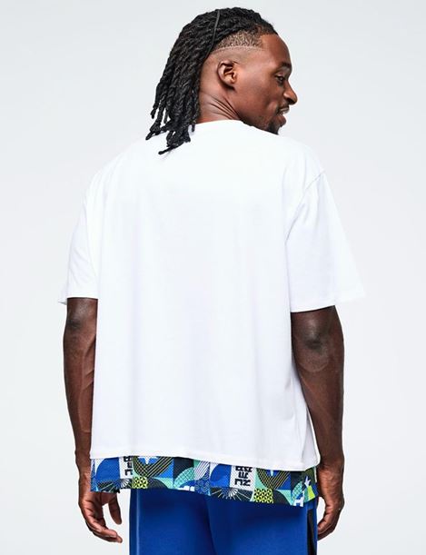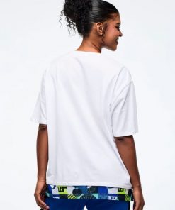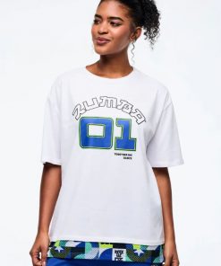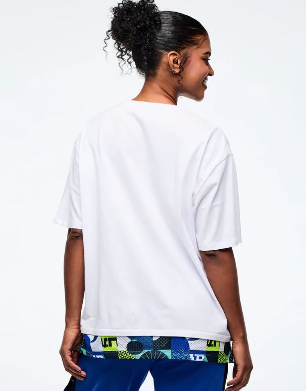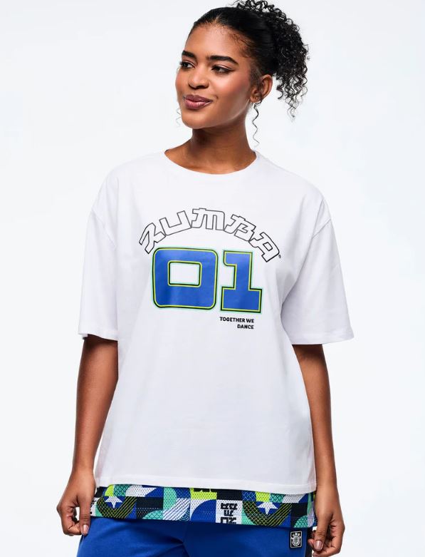 Turn heads in this innovative tee that pushes boundaries with its striking design details. The extended double layered mesh hem panel creates dimension and movement, while side vents at the bottom opening enhance breathability and style. A bold Zumba-exclusive graphic dominates the front, complemented by allover print on the bottom combo panels for a cohesive look. Reinforced rib knit collarband ensures durability, and the oversized long length delivers comfort with attitude.