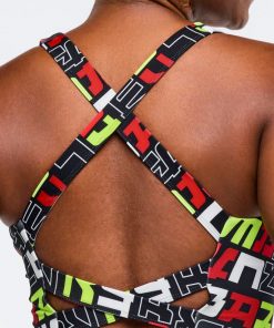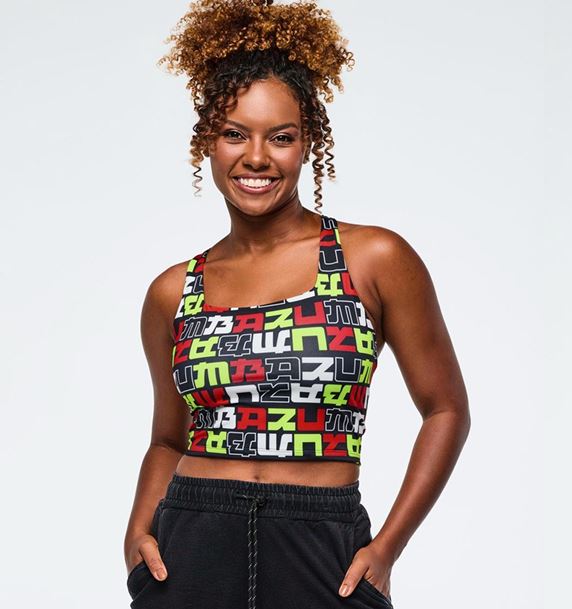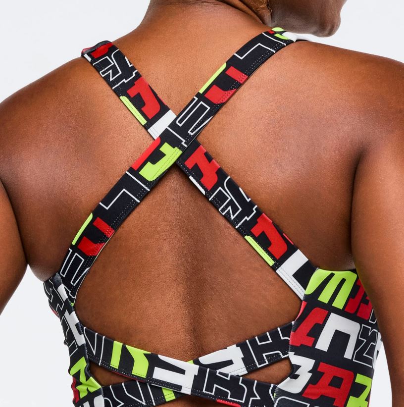 Make a statement with this striking Zumba crop tank that combines bold design with functional support. The open back with crossover straps delivers stability while showcasing your movement, while the lined front body ensures confidence through every turn. Encased elastic straps keep everything secure without restriction, and the vibrant graphic allover print captures Zumba’s energetic spirit. The slim, cropped cut hugs your frame perfectly, letting you dance with complete freedom and style.
