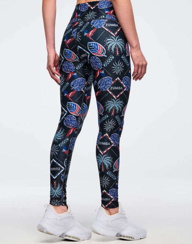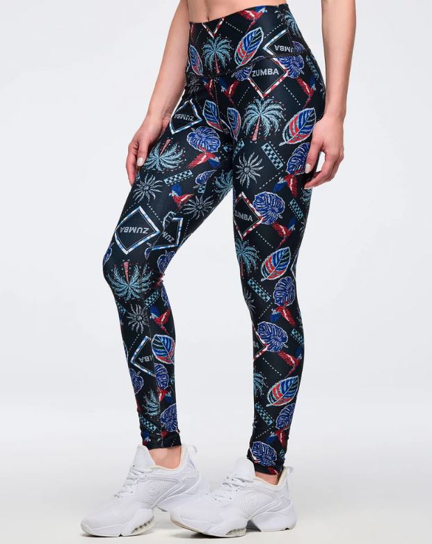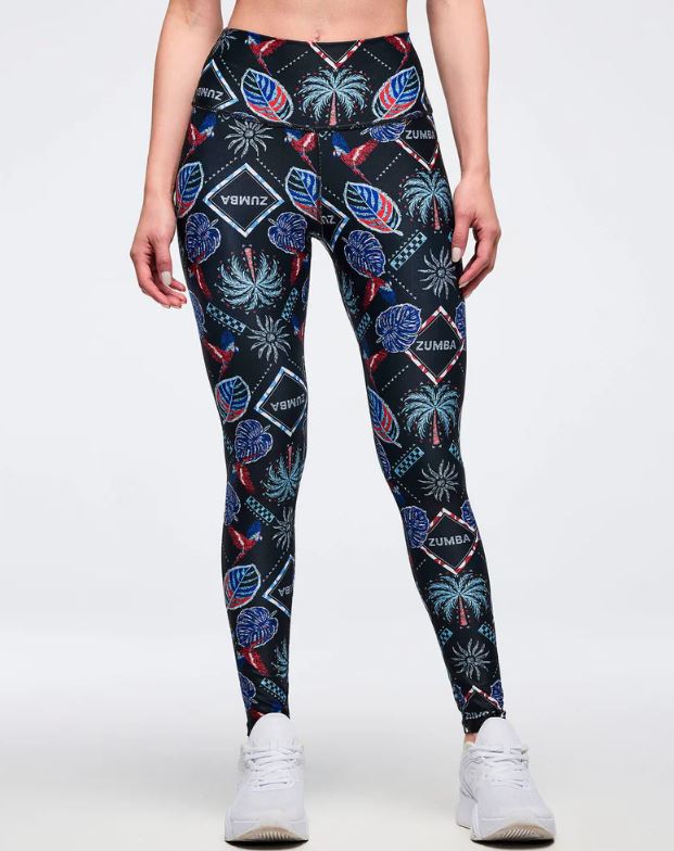 Dance with confidence in these striking high-waisted ankle leggings featuring an exclusive Zumba allover print in dynamic blue and red tones. The secure high waistband delivers support without restrictive internal elastic, creating a clean, flattering line from hip to ankle. The 26″ inseam and slim silhouette provide a sleek fit that moves with your body, making these leggings your new essential for every workout, class, and performance.
