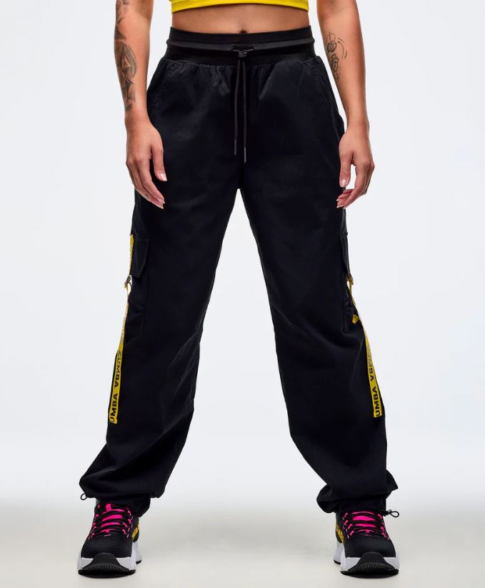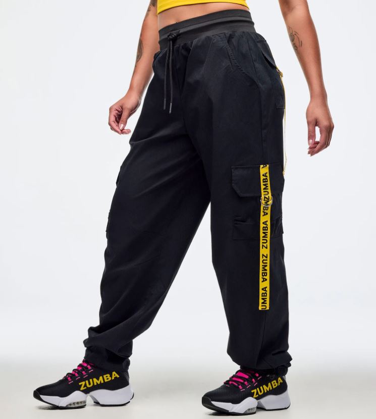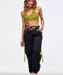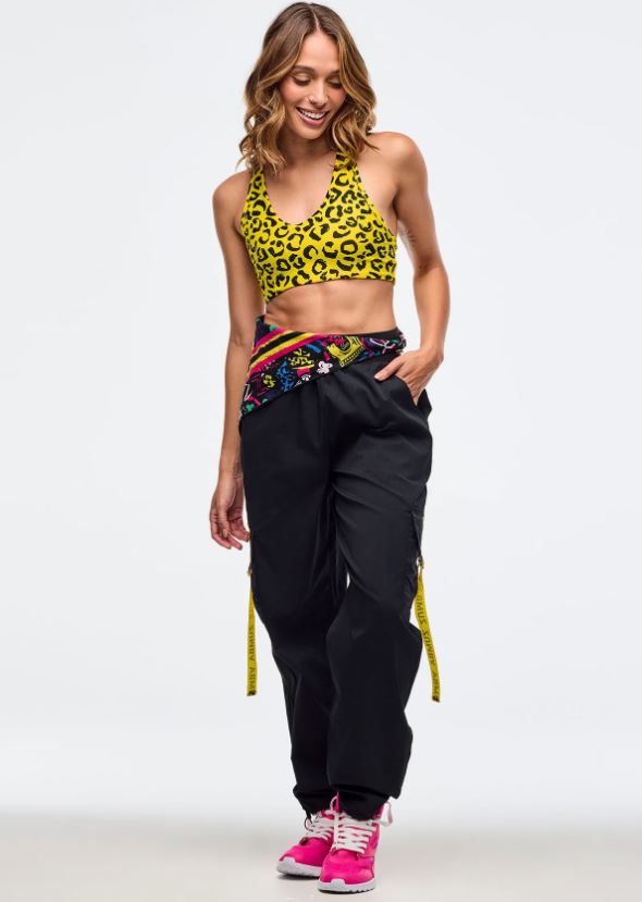 The striking black fabric is accentuated by bold yellow ZUMBA® tape, adding a vibrant pop of color that reflects your energetic spirit.